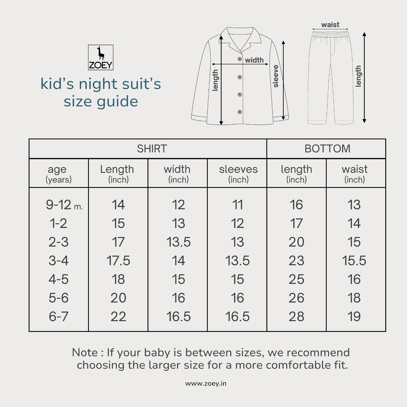 The night suit consists of a long-sleeve button-up top and matching pants. The top features a classic collar, front buttons for easy wear, and a small chest pocket for added charm. The pants come with an elastic waistband for a comfortable and secure fit. The relaxed cut of both the top and bottoms allows for freedom of movement, ensuring a restful night's sleep.
