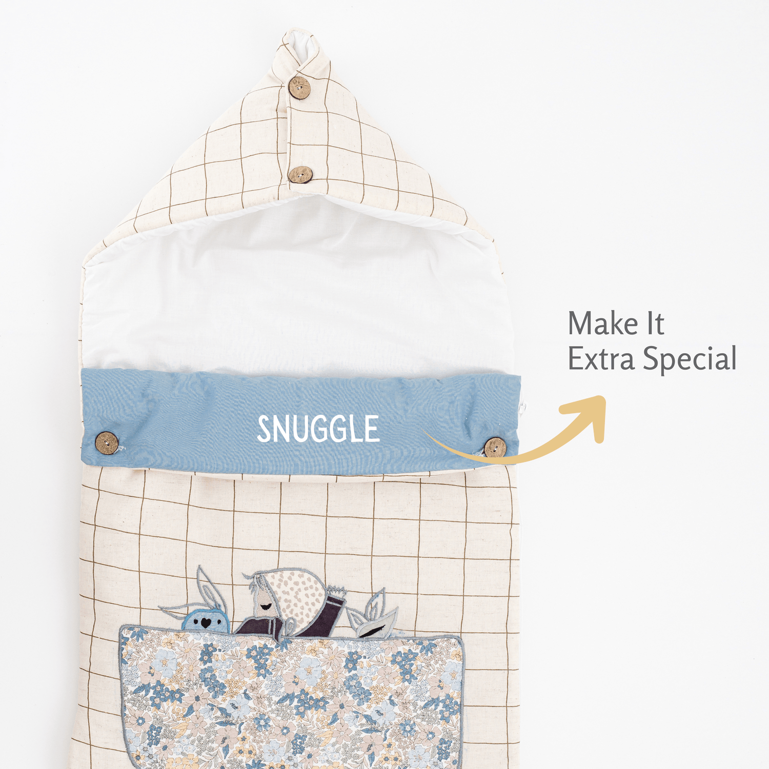 The exterior has detailed sleepy baby & a wolfie toy patchwork design while the inside is soft off white cotton layer. The homebrewed exclusive patchwork design is meticulously appliqued by local skilled artisans at our manufacturing unit. A zip runs along the sack for easy dressing.