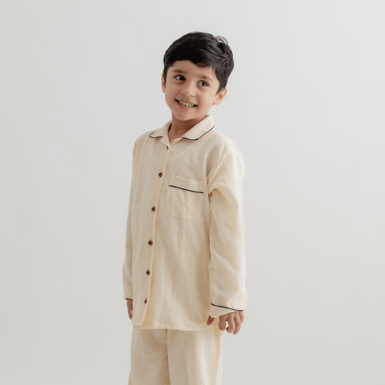 Let comfort take over with this adorable full-sleeve cotton nightsuit for kids. Made from premium breathable cotton, this pajama set is gentle on your little one’s skin, making it ideal for all-day lounging or a restful night’s sleep. The nightsuit's delicate buttercream yellow is both timeless and unisex. It features Wooden Buttons, a relaxed collar, and a classic fit. Designed with love and comfort in mind, it's the perfect blend of cozy and cute—ideal for both bedtime cuddles and morning giggles.