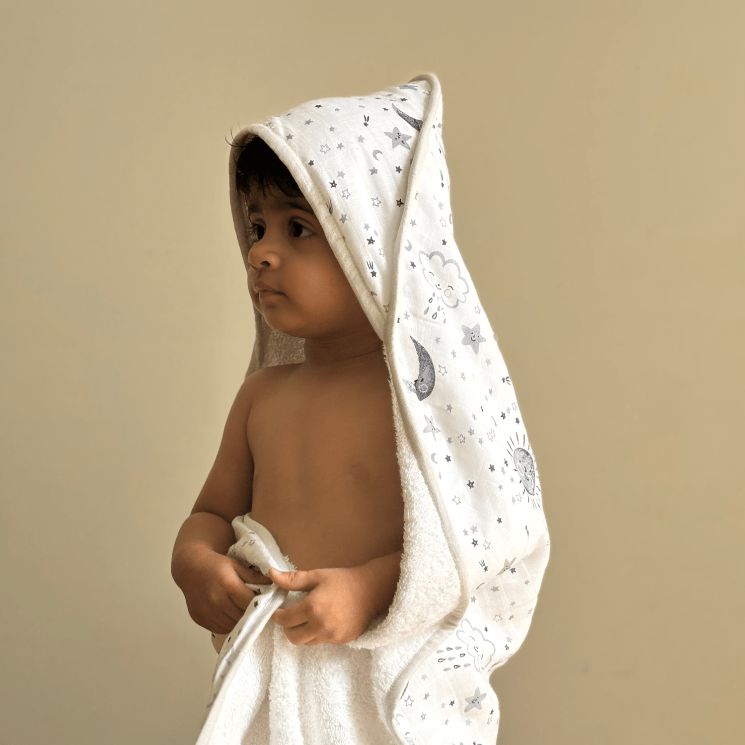 Zoey’s Hooded Baby Towel is made from gentle Terry cotton Toweling on one side to soak up the suds from bath time and a plush soft Organic Muslin on the other to keep baby snuggled and warm. Babies are unable to regulate their body temperature like adults can so warmth is another key factor when it comes to baby towels. The cotton terry in a bath towel is thick and absorbent – perfect for keeping your little one dry and warm and avoiding post-bath chilliness. And the breathable soft muslin is very gentle on the baby’s skin. The combination of Muslin & Terry makes the towel both extra absorbent and easy to wipe.
