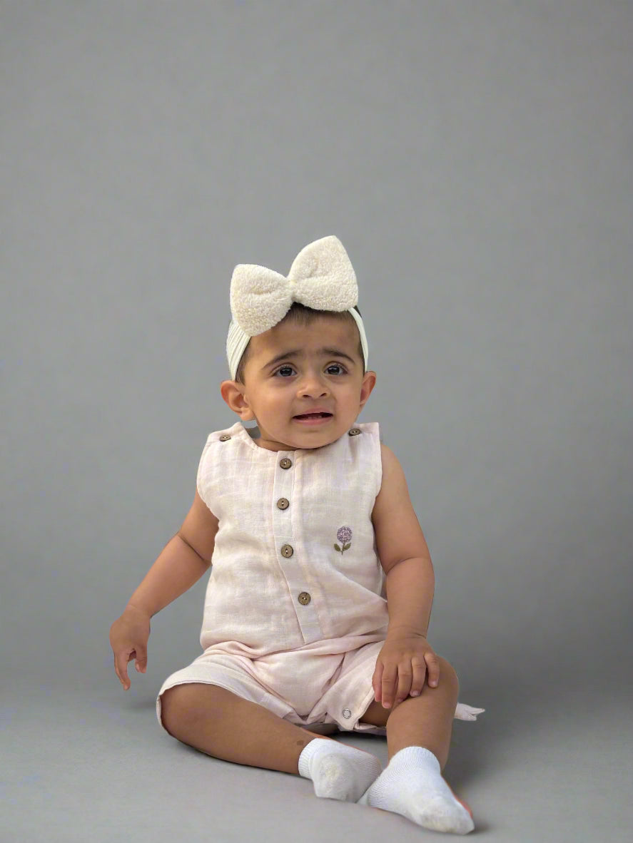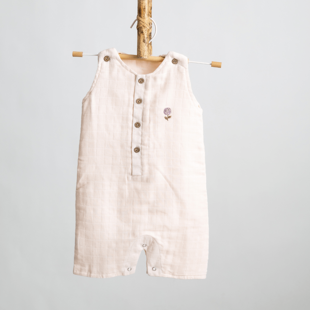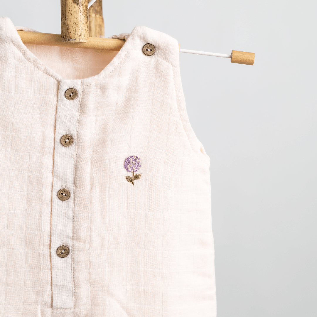 Our Muslin Rompers are finally here!! Presenting Zoey’s thoughtfully designed Muslin Romper with hand embroidered motif to keep your little one classy & comfortable. We made our rompers using double layers of fabric to ensure that the baby is layered well throughout the day to night. Ideal for summers, the breathable & soft muslin fabric is gentle on the skin. It offers plenty of freedom for crawling and exploration, while still maintaining a timeless look. We carefully picked coconut buttons for the neckline and shoulders while metal snap buttons at the bottom for ease of changes. The hand-embroidered dahlia flower design lends an enchanting beauty to it. This piece is so cute on its own and can also be paired with your favorite accessories!