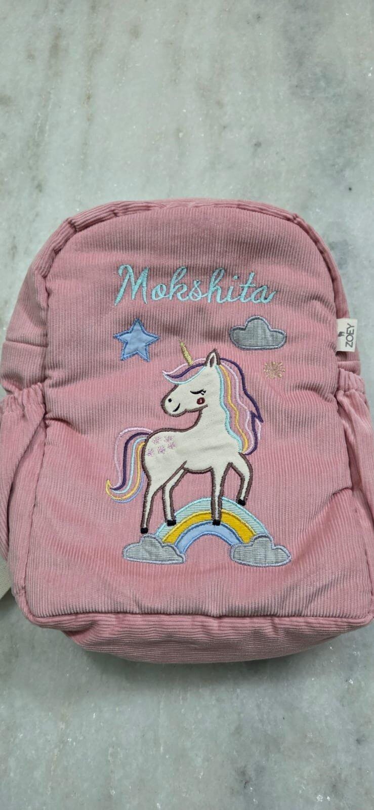 Introducing our Unicorn Charm School Bag – a magical companion for your little one’s everyday adventures! Crafted in soft pink corduroy and adorned with an adorable embroidered unicorn, rainbow, star, and cloud details, this bag brings imagination to life with every step.