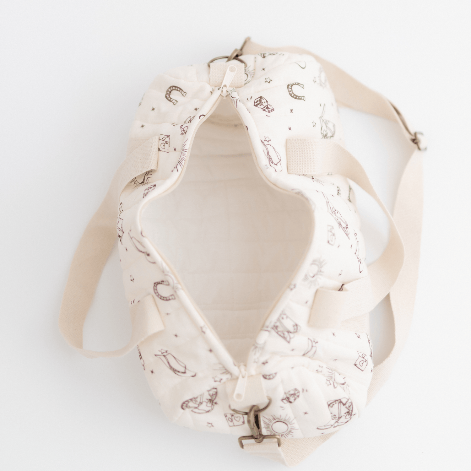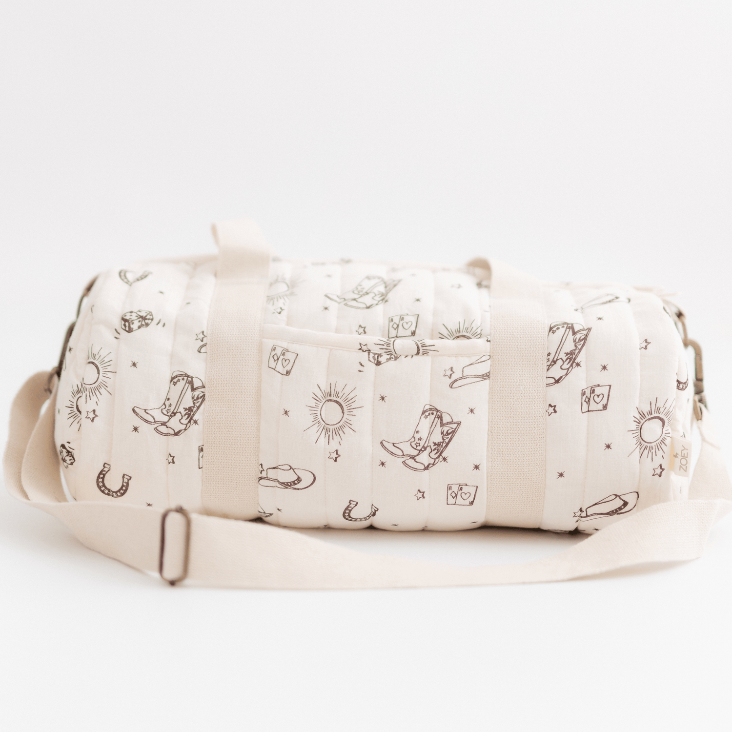 A sports bag, a weekend bag, an activity bag – call it whatever their little adventures demand! Presenting Zoey’s quilted cotton duffle bag in our charming Cowboy Boots print, designed for kids who love a hint of whimsy and a whole lot of style. Whether they’re riding off to a school activity, a playdate, a sleepover, or a weekend getaway, this bag is built to be their perfect companion.