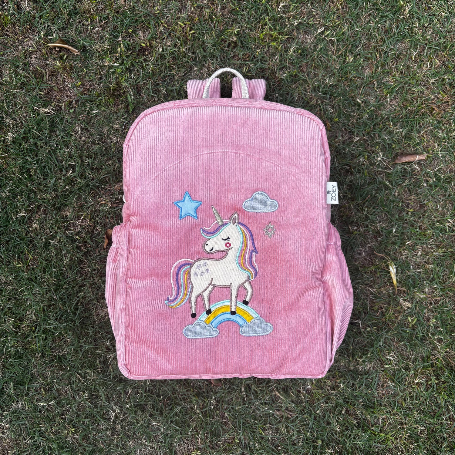 Introducing our Unicorn Charm School Bag – a magical companion for your little one’s everyday adventures! Crafted in soft pink corduroy and adorned with an adorable embroidered unicorn, rainbow, star, and cloud details, this bag brings imagination to life with every step.