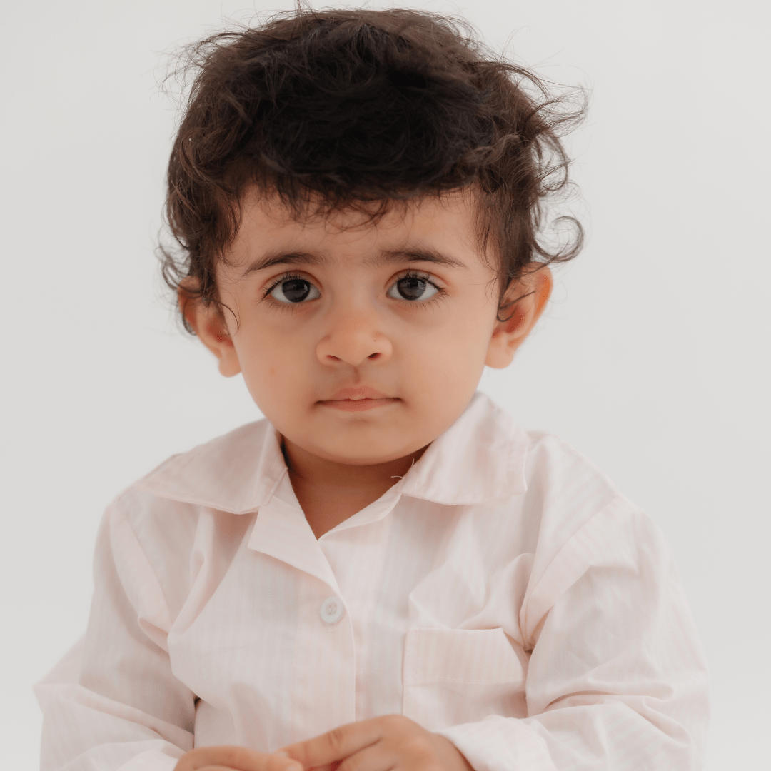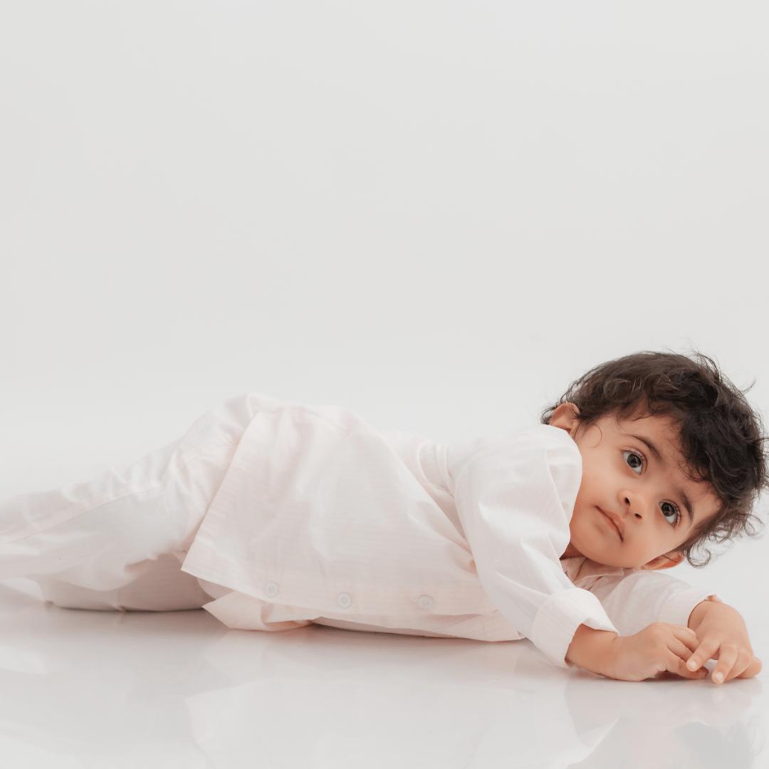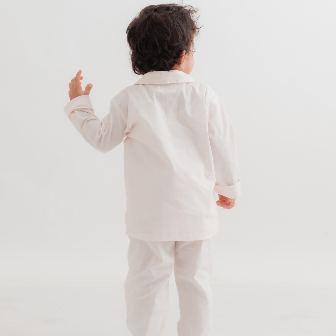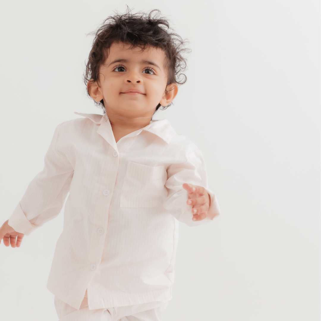 Let comfort take over with this adorable full-sleeve cotton nightsuit for kids. Made from premium breathable cotton, this pajama set is gentle on your little one’s skin, making it ideal for all-day lounging or a restful night’s sleep. The nightsuit's breezy blush stripes is both timeless and unisex. It features wooden buttons, a relaxed collar, and a classic fit. Designed with love and comfort in mind, it's the perfect blend of cozy and cute—ideal for both bedtime cuddles and morning giggles.
