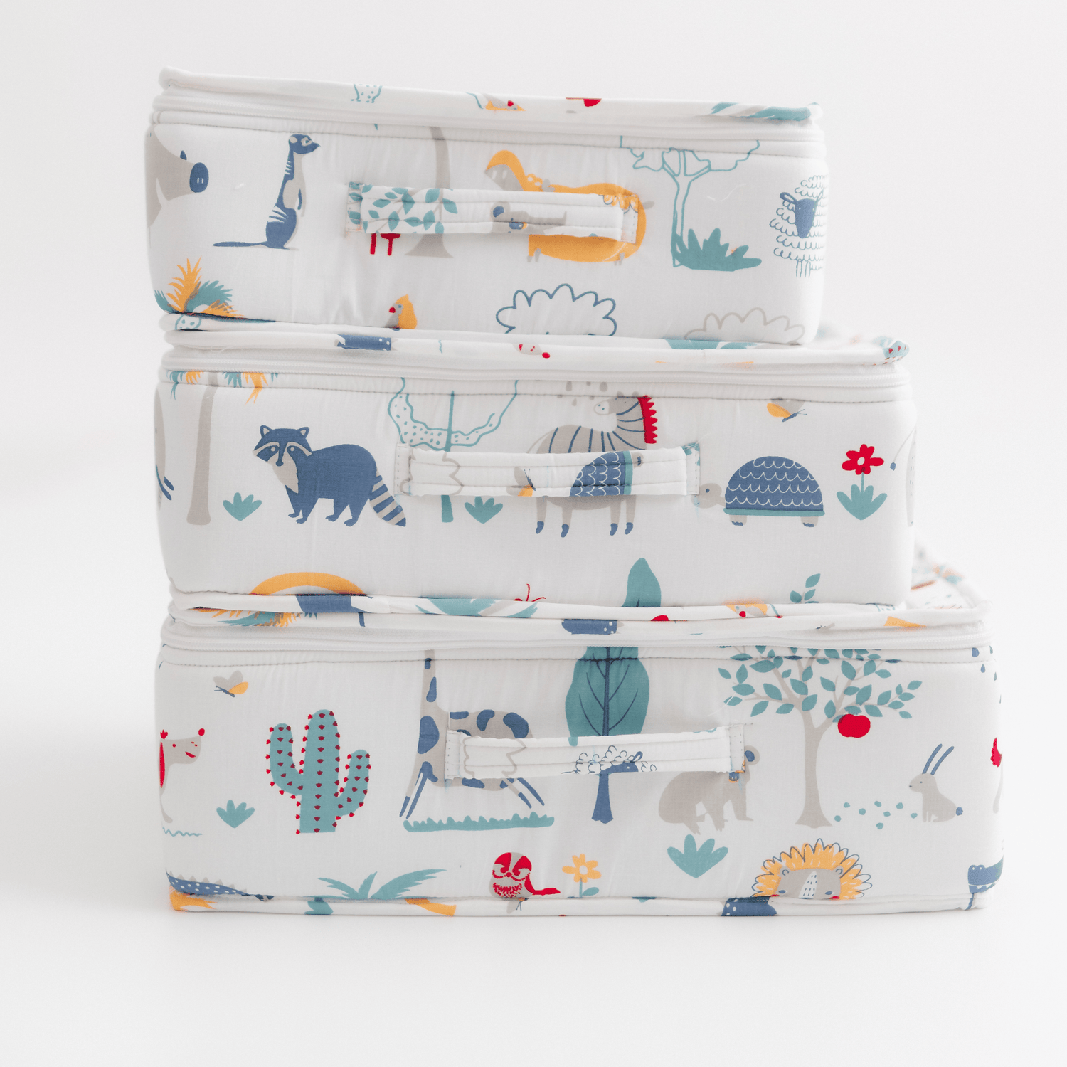 The playful Happy Animal Tribe print features friendly creatures and a lively pattern that brings joy and personality to practical storage. These aren’t just suitcases—they’re adorable storage companions that brighten up the nursery or travel bag.